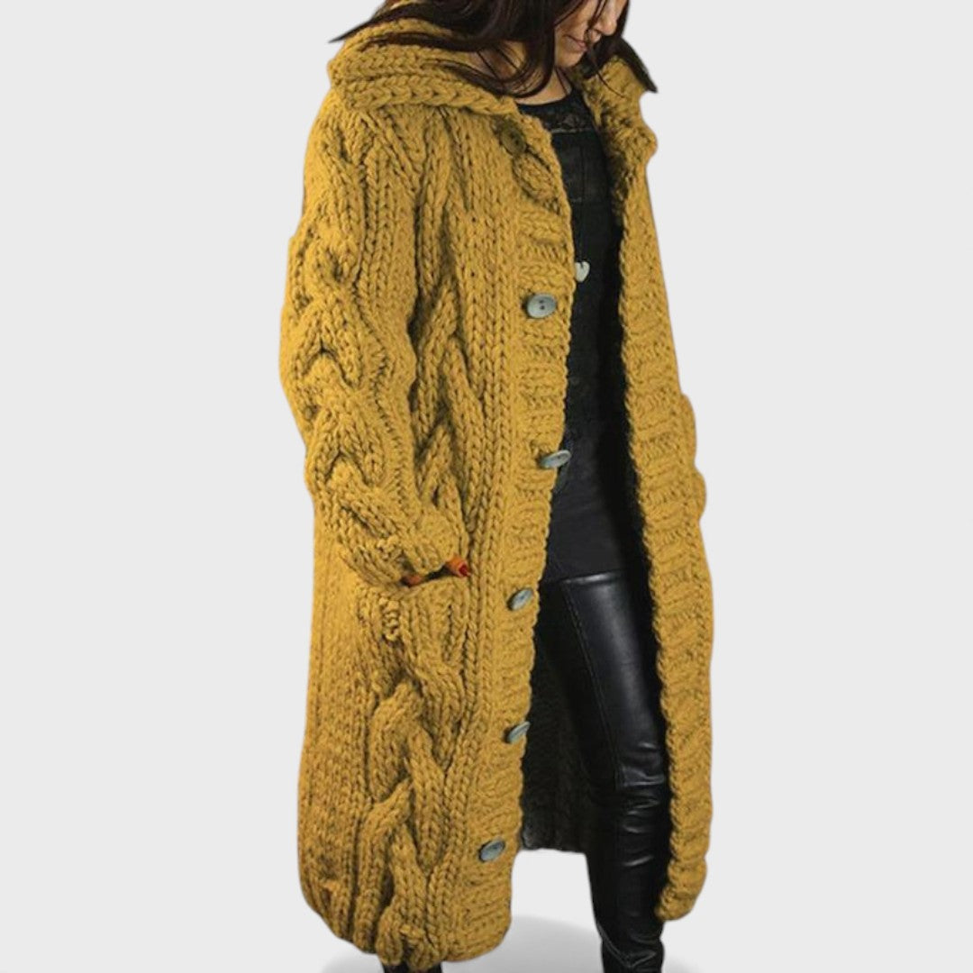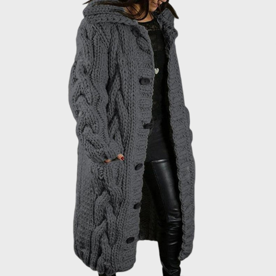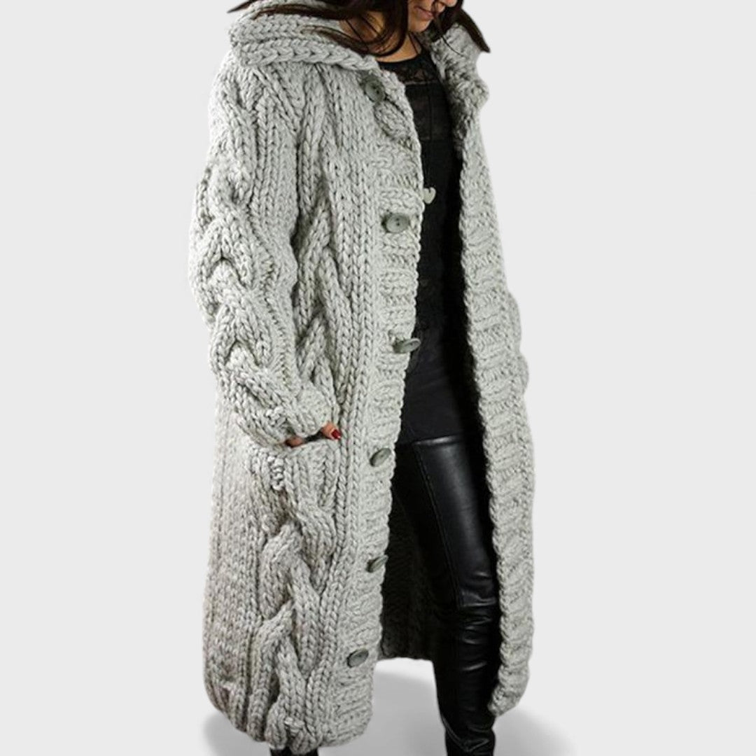 Il Capotto elegante e confortevole Karina ti avvolge in calore, texture e stile senza tempo. Realizzato in un morbido e traspirante misto di maglia, presenta un design oversize a trecce che aggiunge sia comfort che carattere. La silhouette a lunghezza intera offre una dolce copertura per la pancia e un drappeggio elegante, mentre il cappuccio e le tasche laterali forniscono un'eleganza pratica. Che tu stia uscendo per una passeggiata rilassata o incontrando amici, Karina ti tiene alla moda, accogliente e senza sforzo raffinata.