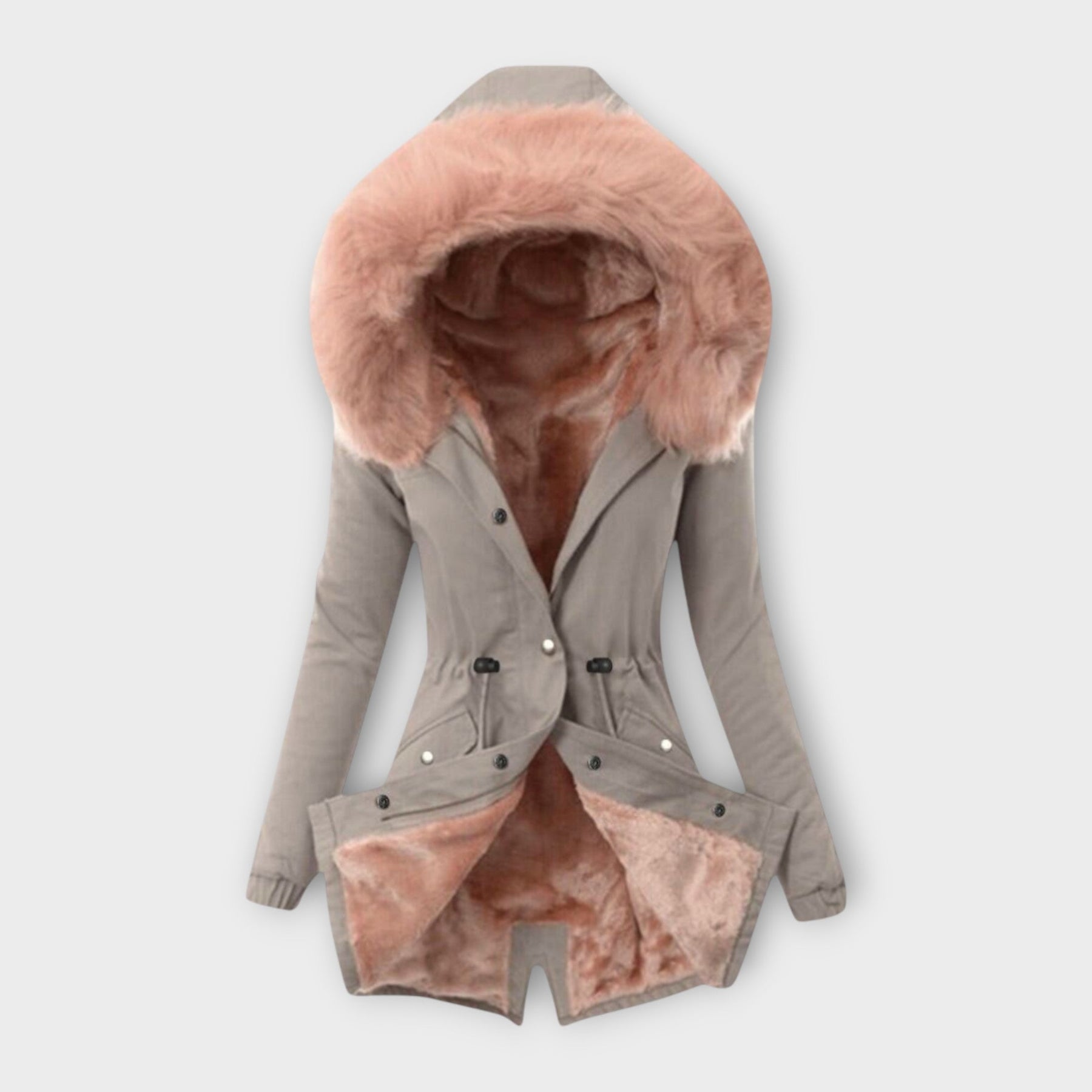 Il cappuccio generoso è rifinito con morbida pelliccia sintetica, che non solo protegge dal vento e dalle intemperie, ma aggiunge anche un tocco di eleganza.