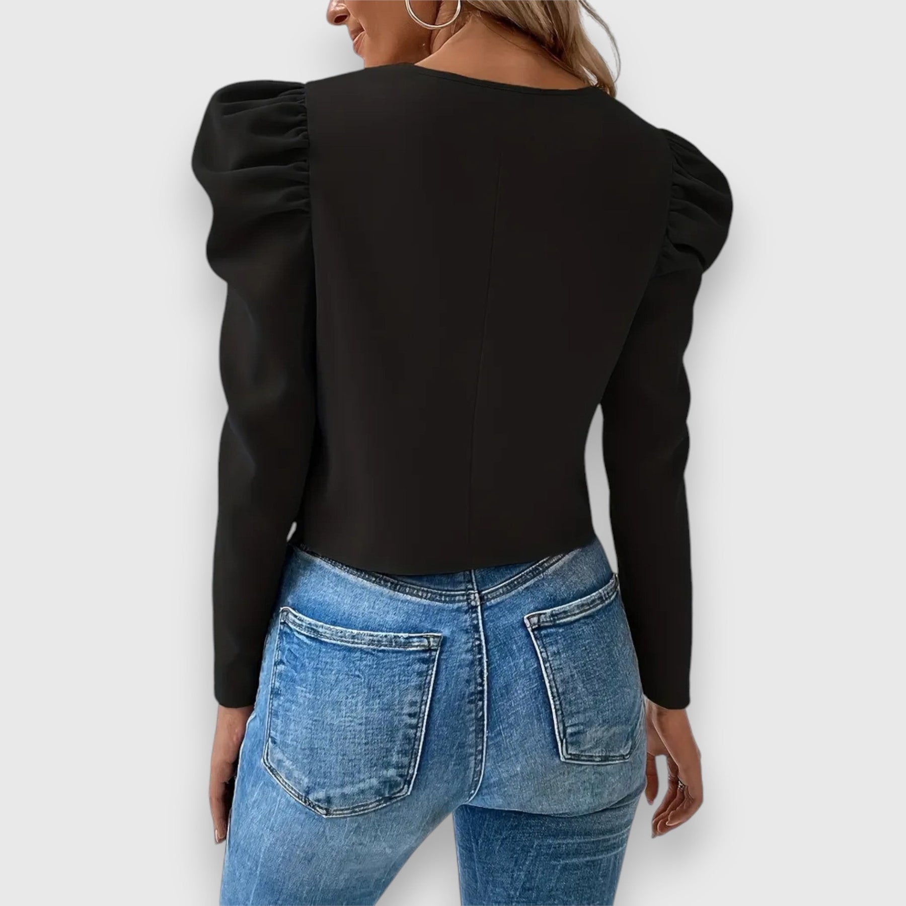 • Dettaglio maniche a palloncino – Look femminile e moderno.